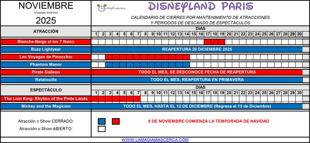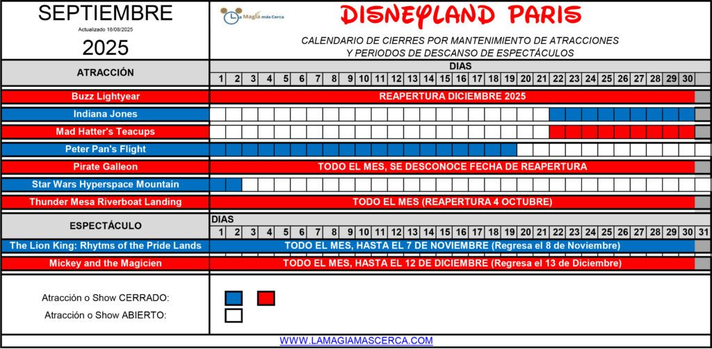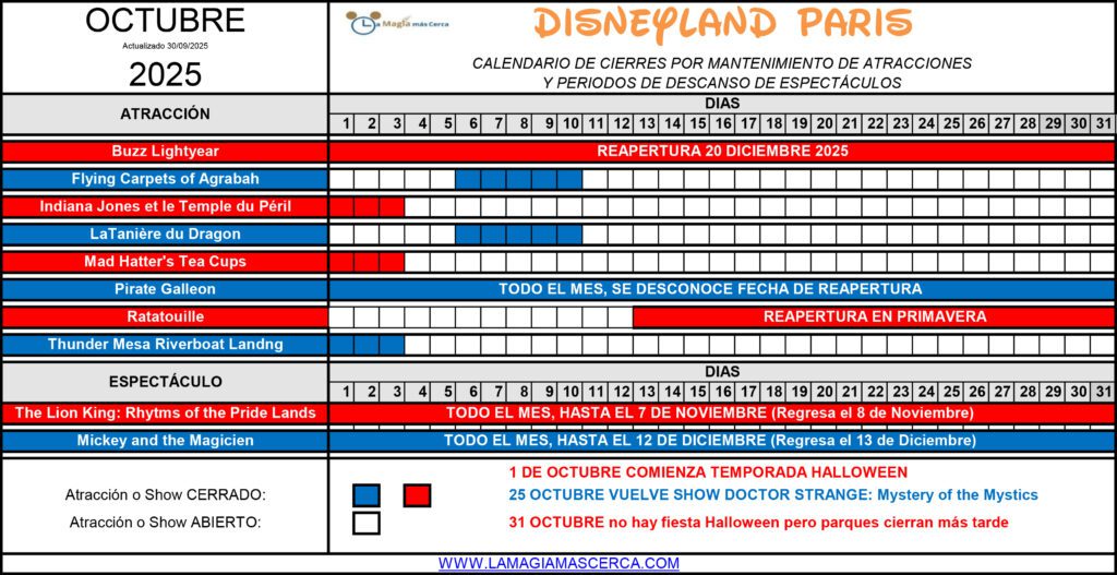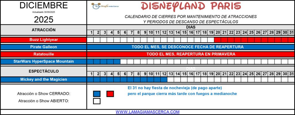 En esta página intento mantener al día toda la información de cierres de atracciones por mantenimiento y/o descansos de espectáculos, animaciones de temporada, etc… Lamentablemente últimamente Disneyland Paris solo comunica esta información a 2-3 meses vista, con lo que es probable que cuando reservemos nuestro viaje todavía no sepamos si nos perderemos alguna atracción que nos interese por «cierre».
